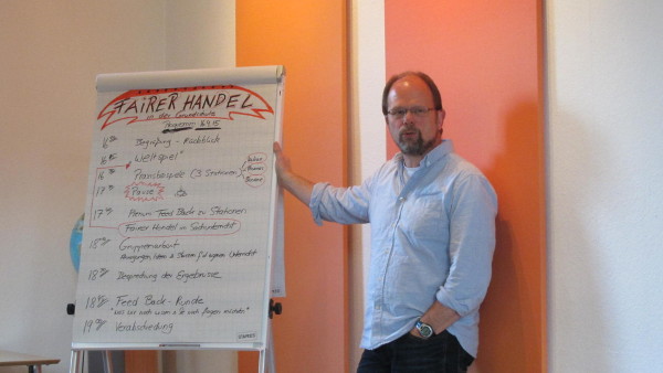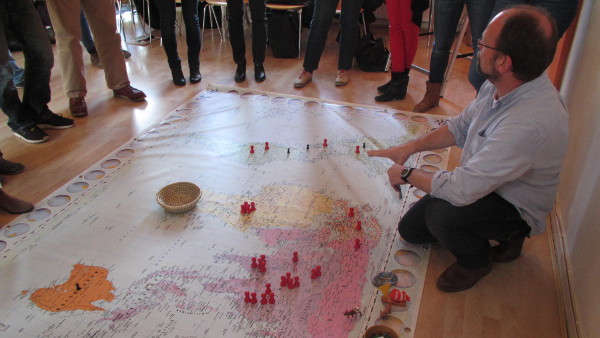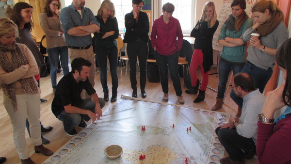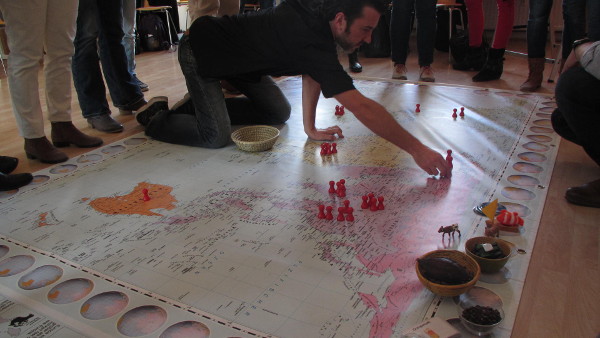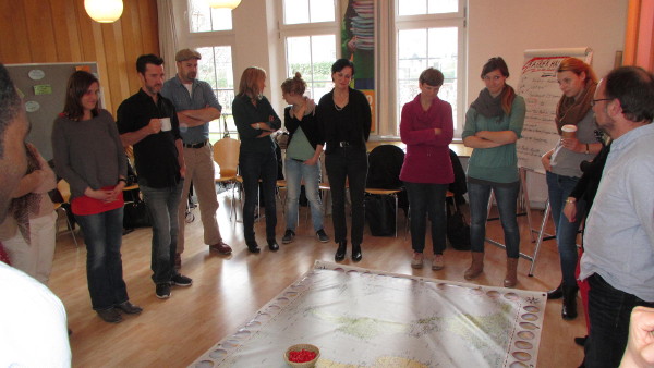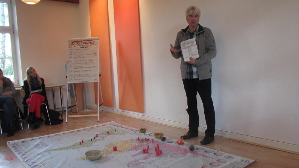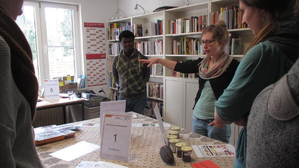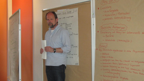 Nach einer inhaltlichen Einführung in den Fairen Handel anhand von Präsentationen und Lernstationen wurden erprobte Unterrichtsbeispiele zu den Themen Bananen, Ananas und Schokolade vorgestellt und Methoden dazu ansatzweise ausprobiert (z.B. das „Weltspiel“). Mit ihrem Beitrag „Menschen in den Anbauländern – welche Bilder haben wir von ihnen und welche Bilder vermitteln wir?“ und den sich daran anschließenden Aufgabenstellungen für den Unterricht regte die Grundschullehrerin Caroline Marx eine kritische Auseinandersetzung mit Vorurteilen und Stereotypen über die Menschen anderer Länder an, die uns häufig noch in Bildungsmaterialien, aber auch in der eigenen Arbeit begegnen. Martin Kelpe vom LI-Referat Sachunterricht veranschaulichte den Teilnehmer/innen zudem mit kleinen praktischen Aufgabenstellungen eine Einordnung des Themas in die Hamburger Rahmenpläne (Kompetenzen, Inhalte, Unterrichtsbezüge).